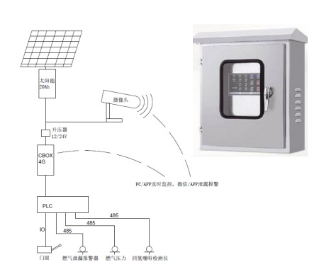 本方案支持实时监控、调压柜开关、泄漏、压力、四氢噻吩传感器接入。自主研发四氢噻吩、视频监控、压力、流量、泄漏、开关六合一在线检测设备,实现数据实时报警、设备入侵预警喊话等功能。